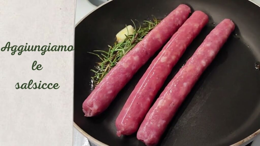 - Nella stessa padella, aggiungi le salsicce di pollo e fallo rosolare fino a quando non sono ben dorate da tutti i lati. Aggiungi il vino bianco e alza la fiamma per far evaporare l'alcol.